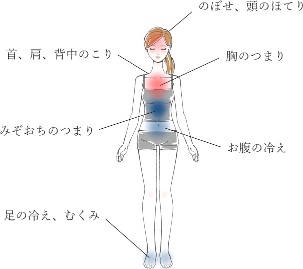| 全身の症状 | 冷え性、慢性的な疲れ、倦怠感、多汗、ほてり、のぼせ、ホットフラッシュ、等々 |
