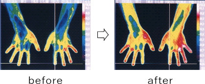 下記の写真は、私が筑波大学で撮影したものです。鍼の前後での皮膚温の上昇をサーモグラフィーで観察しました。鍼によって血流が改善したことがわかります。